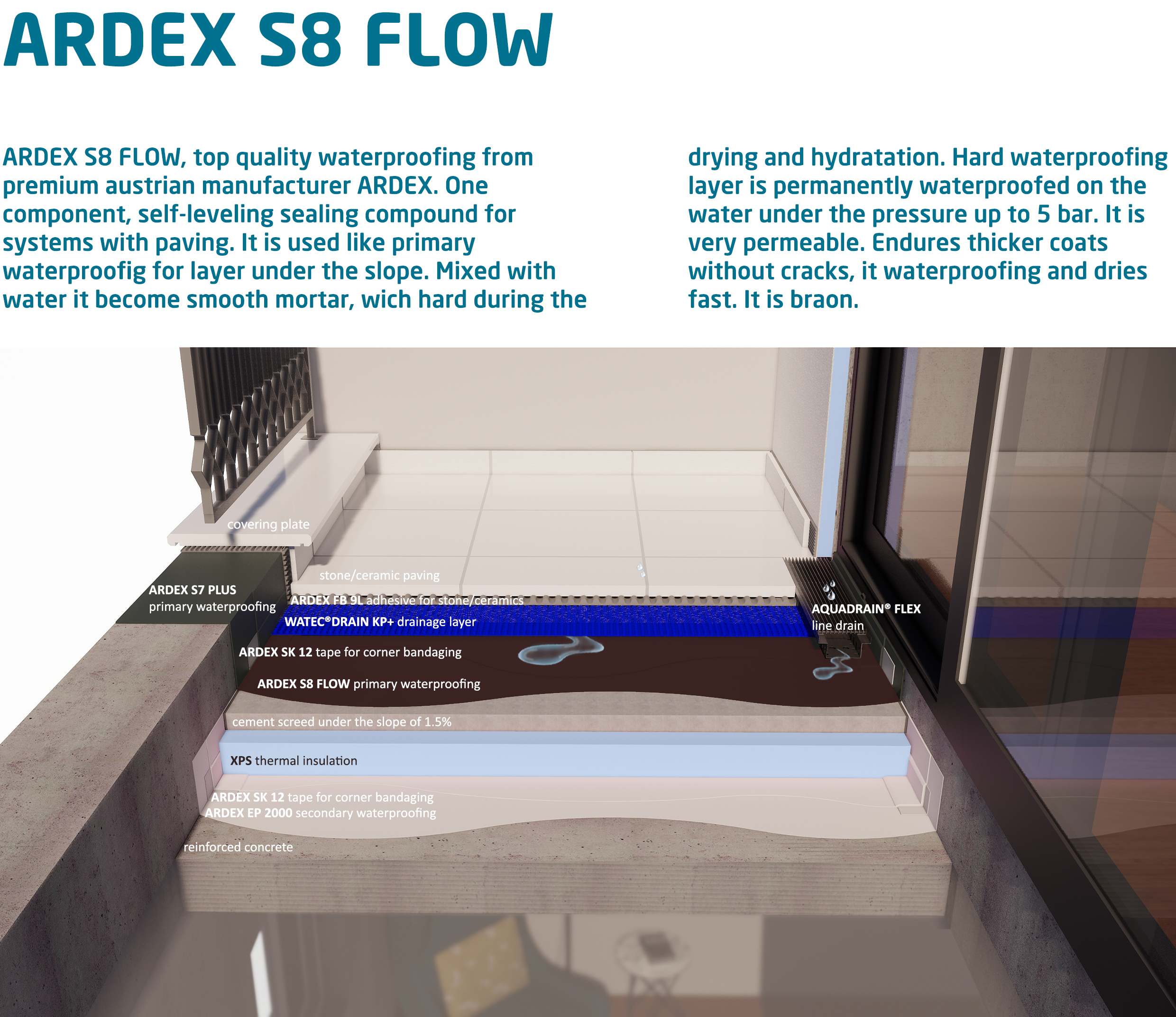In the download zone you can find a more detailed description of the products Ardex 8+9, Ardex S 7 Plus, Ardex S 8 Flow, Ardex EP 2000, Watec®Drain KP+, AquaDrain® EK and AquaDrain® FLEX.