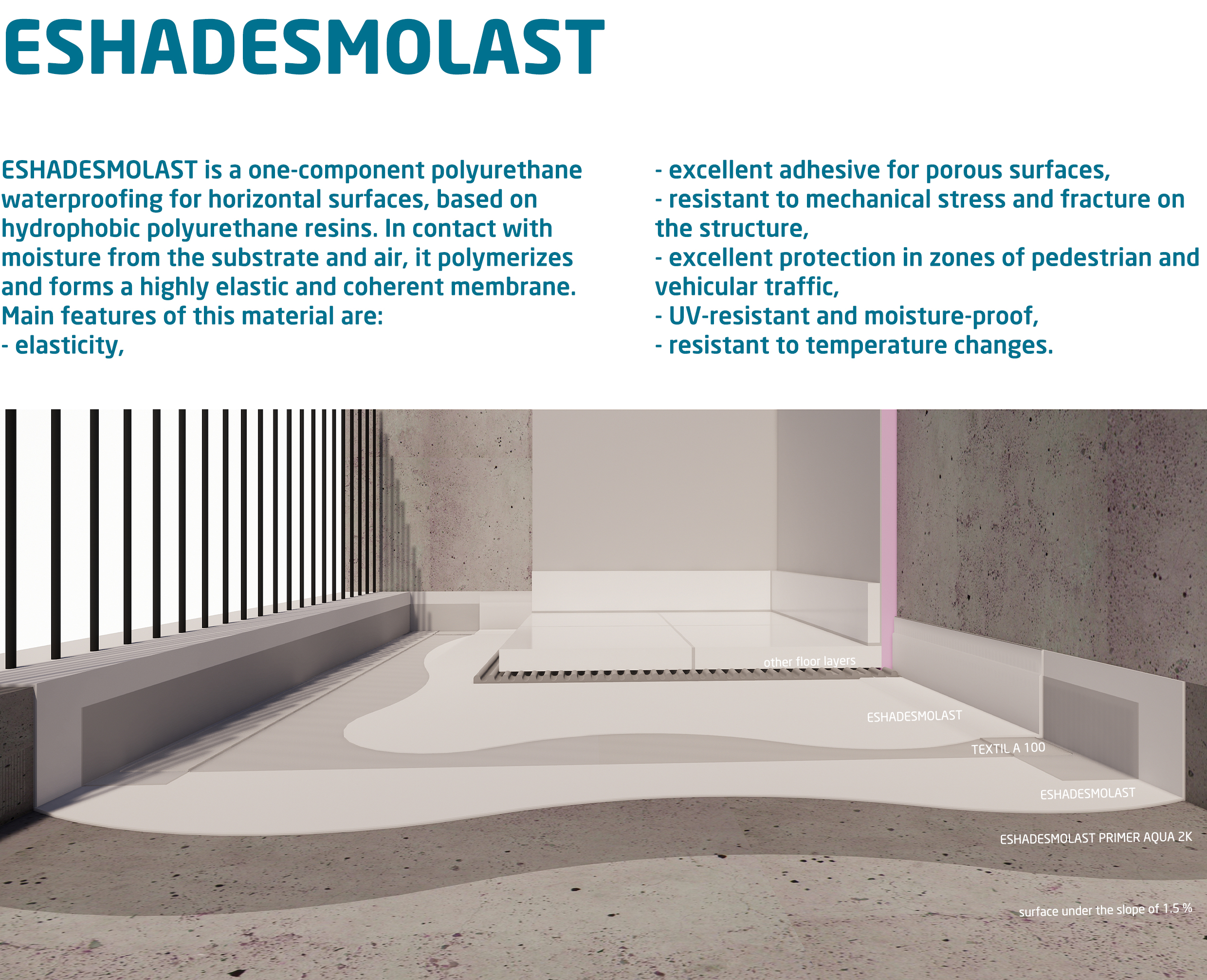 Esha is a Greek manufacturer of waterproofing. Their balcony system is made of few products: Eshadesmolast Primer Aqua 2K, Eshadesmolast and the Textil A100 -  bandage between two layers of Eshadesmolast which has the purpose to enhance waterproofing.